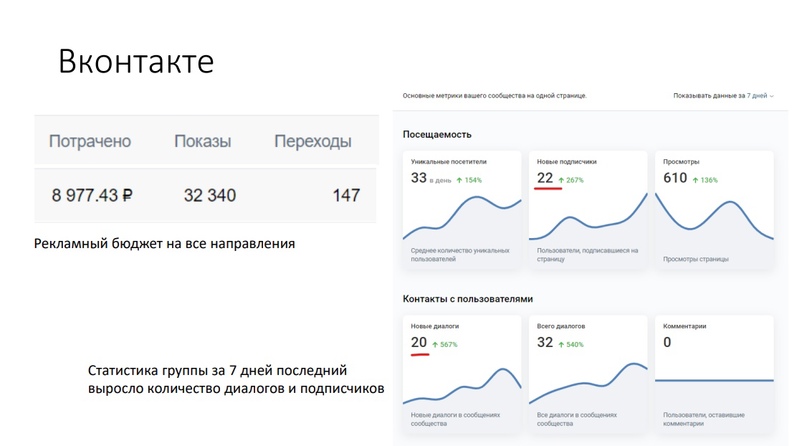 Была проделана очень большая работа по работе с рекламными макетами, текстами, общением со службой поддержке Вконтакте. Также с Заказчиком выработали новую воронку презентации услуг.