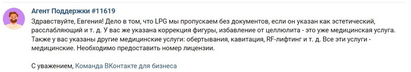 Вконтакте запрещает продвигать следующие услуги без мед.лицензии - это: LPG с функцией коррекции фигуры и борьбы с циллюлитом, лимфатический массаж, кавитация, миостимуляция, применение лазера, УЗ процедуры, RF-лифтинг, мезотерапия, карбокситерапия, микротоки, карбоновый пилинг, биоревитализация, лечение акне, различные виды обёртываний, дарсонвализация, прессотерапия, электролиполиз, криолиполиз и многое другое.